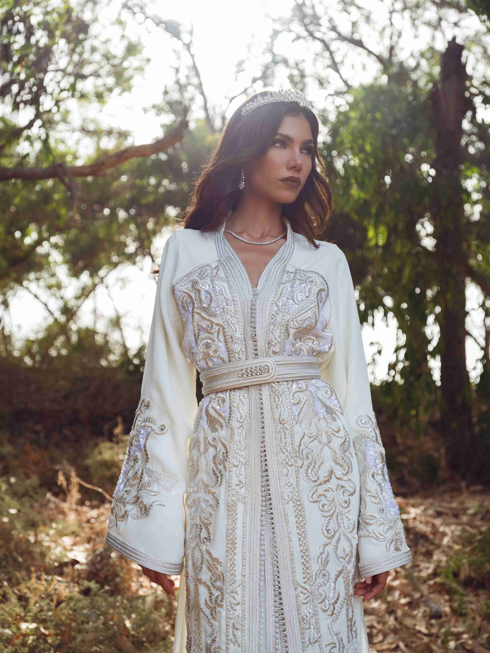 Trois rangs de dfira viennent structurer la silhouette avec sophistication, révélant une pièce rare, pensée pour une mariée à la recherche d’une élégance profonde et intemporelle.